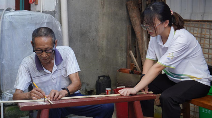 7月9日下午,實踐隊來到三明市非物質(zhì)文化遺產(chǎn)蚯蚓燈制作的傳承人黃茂生老師的家中庭院,對蚯蚓燈進行從劈竹到糊紙過程的學(xué)習(xí)。蚯蚓燈因沒有龍頭龍尾,伸縮自如,形似蚯蚓而得名,寓意像蚯蚓一樣越斷越發(fā),生生不息。制作蚯蚓燈要經(jīng)過“劈竹、畫線、鋸痕、燒彎,箍緊,糊紙”等過程,制作時要有細心的操作和耐心的等待。黃茂生老師在接受實踐隊采訪時這樣說道:“當(dāng)代學(xué)習(xí)這門技藝的年輕人很少了,但不學(xué)習(xí)傳統(tǒng)文化就會被遺忘,希望有更多的青年能關(guān)注傳統(tǒng)文化、學(xué)習(xí)傳統(tǒng)文化。”我們在動手實踐中也體悟到蚯蚓燈的工藝智慧和非遺傳承人的工匠精神,更加堅定我們守護非遺文化的決心,進一步營造參與非遺保護傳承的氛圍。通過和非遺傳承人老師學(xué)習(xí)制作蚯蚓燈,同學(xué)們更加深刻感受到傳統(tǒng)文化是中華民族的“根”和“魂”,只有守好“根”的記憶,才能在未來的道路上走得更遠。