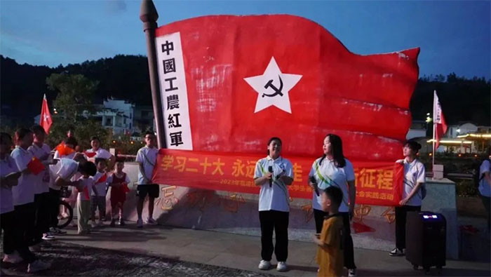 實踐隊員也對大田鄉(xiāng)的古厝建筑和特色農(nóng)產(chǎn)品進行拍攝取材,著力創(chuàng)作符合大眾審美、展現(xiàn)地域特色的文創(chuàng)產(chǎn)品,助力大田鄉(xiāng)的旅游宣傳,為當(dāng)?shù)剜l(xiāng)村振興貢獻自己的青春力量。當(dāng)晚,實踐隊員還在紅軍文化主題公園舉辦藝術(shù)黨課,給當(dāng)?shù)厝罕娧莩恕队成郊t》《沒有共產(chǎn)黨就沒有新中國》,并通過歌曲作為線索,講述紅色故事,引發(fā)了聽眾的共鳴。同學(xué)們發(fā)揮自身的特長和優(yōu)勢,創(chuàng)新宣講方式方法,讓黨的創(chuàng)新理論“聲”入人心,進一步傳播黨的二十大精神。面對廣大群眾進行鄉(xiāng)村故事宣講需要更加“接地氣”,多一些生動案例和真情實感,亦可結(jié)合貼近民生的“鄉(xiāng)音”,扎根鄉(xiāng)土深處,逐夢鄉(xiāng)村振興。通過“藝術(shù)+黨課”的形式,在紅歌演唱與紅色誦讀中傳承紅色基因,匯聚起不忘初心、踔厲奮發(fā)的磅礴力量。