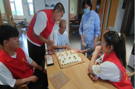 在活動開始前,實踐成員在前期準備工作中,通過與管理人員和老人們的交流,了解了老人們的特點和需求,掌握了與老人溝通、照顧和陪伴的技巧。活動期間,在主持人的“親愛的爺爺奶奶,上午好,讓我們一起唱起來”下,敬老院中傳出一陣陣悠揚的歌聲和歡聲笑語。“相走田、馬走日、卒直走……”在志愿者成員們溫馨的教學(xué)提示下,爺爺和志愿者們激烈的“廝殺”開始了;“奶奶,您今年多大了,家是哪兒的?”“小孩長得可真漂亮,在哪兒上學(xué)啊?”一聲聲溫暖的問候,一句句耐心的回話,我們像在話家常一般走進了老人們的內(nèi)心。志愿成員們的熱情感染了敬老院的人們,而爺爺奶奶們的和藹也溫暖了我們。臨走之際,一聲聲的“下次還來玩啊”回蕩在院子中。