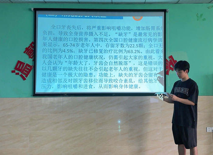期間,“愛牙在行動”老年人口腔健康情況調研宣講實踐團隊還開展了一場別開生面的健康科普宣教+義診活動。隊員們以PPT的形式向老人們集中科普了相關口腔衛生知識,生動形象的語言,簡單易懂的示意圖,有效提高了老人對于口腔問題的認知水平和重視程度。義診現場,隊員們通過現場演示指導老人們正確的口腔衛生行為,為老人解決各種口腔問題。對于個別口腔問題較為嚴重或亟需治療的老人,團隊成員還依次協助他們聯系家人,鼓勵及時就醫,以提高老人的生活質量。
