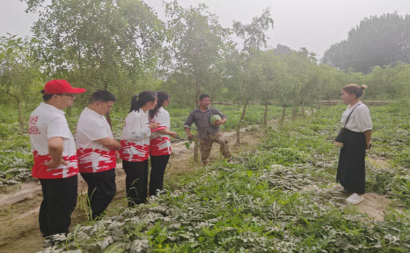 圖為實(shí)踐團(tuán)成員與居民在西瓜地調(diào)查關(guān)于農(nóng)業(yè)種植方面的問(wèn)題