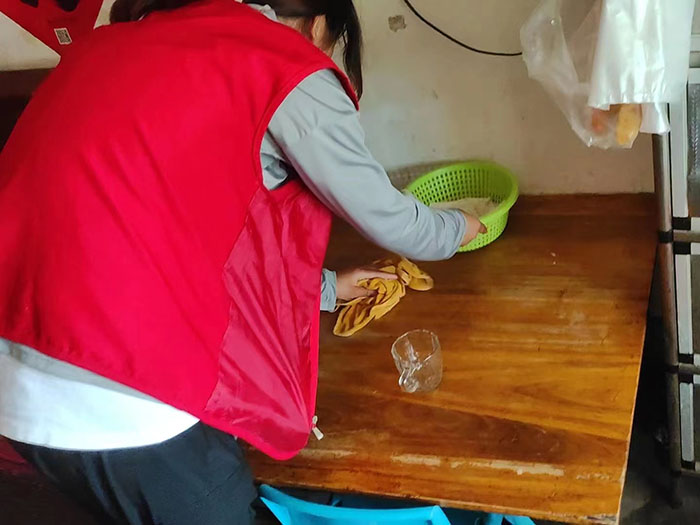 清晨,“擺爛不擺爛”實踐團的5名志愿者會帶著微笑和關懷的態度進入每個房間。然后,志愿者們會開始清理房間中的灰塵,拖地并消毒,確保每個房間都保持整潔和清新的氛圍。