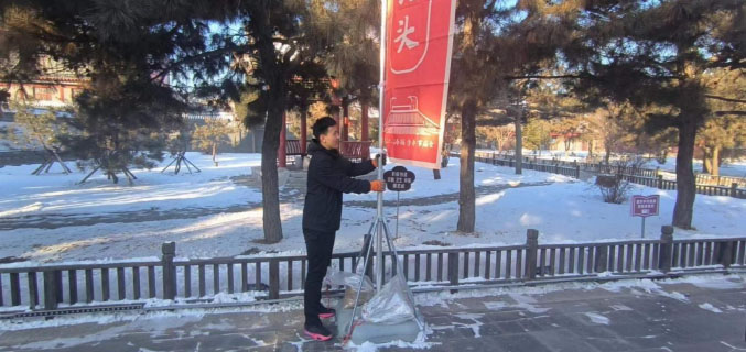 實(shí)踐團(tuán)成員放置景區(qū)宣傳旗幟