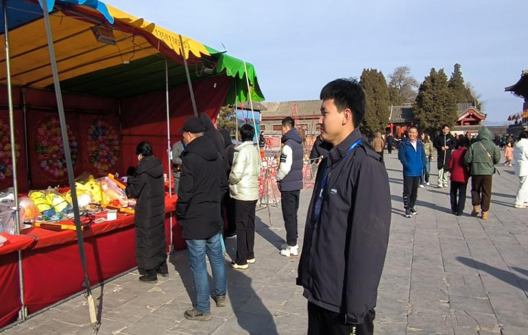 實(shí)踐團(tuán)成員巡視寺外攤點(diǎn)