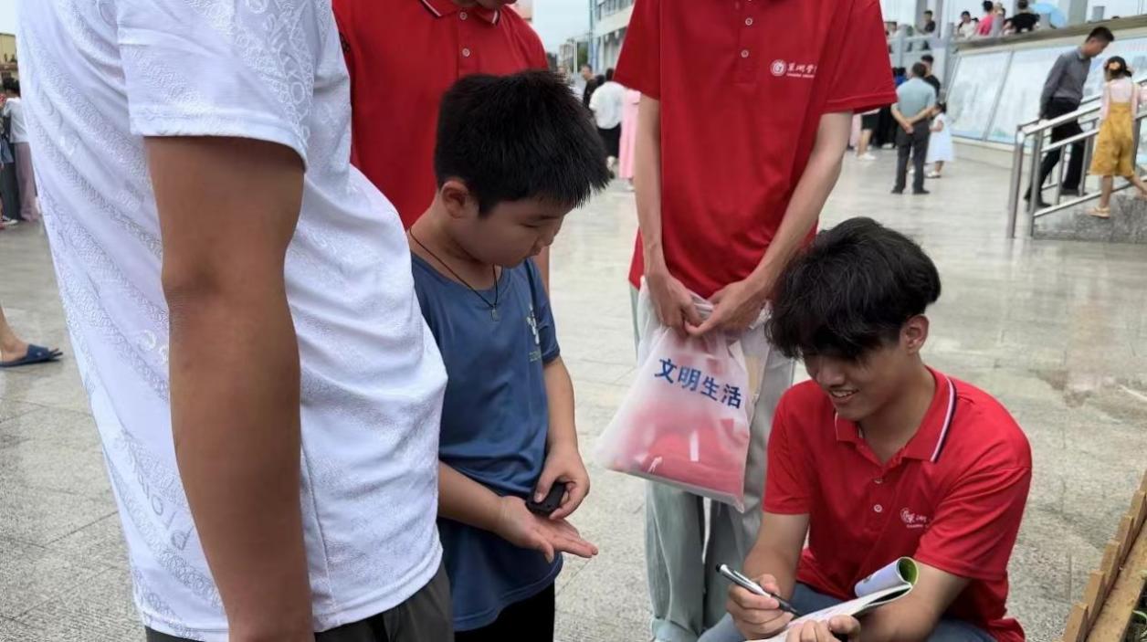 在活動現場,志愿團耐心地解答了孩子們關于學科類的問題。其中有一位志愿者蹲在地上,認真地向一個小男孩解釋著什么。他手中的筆記本上記錄著各種科學原理和實驗步驟,吸引了許多孩子圍觀學習。