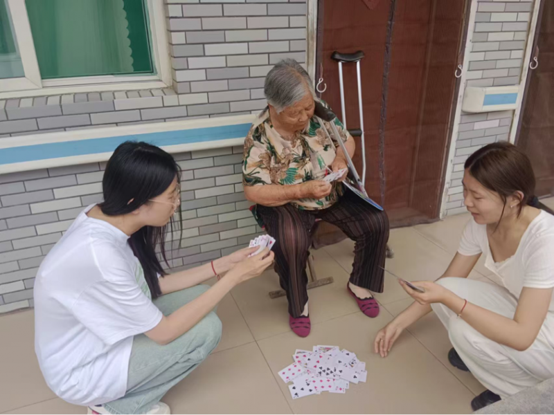實踐團成員與老人一邊打牌,一邊聊家常,搭建與老年人的溝通橋梁,讓老年人真真切切感受到關心與關愛。