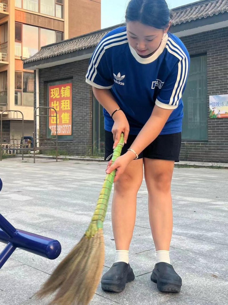 打掃單位家屬院衛(wèi)生(圖為實踐成員李佳)
