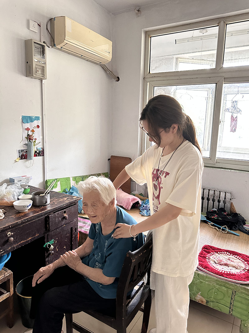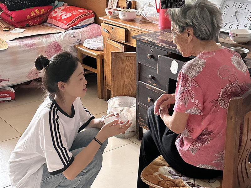 實踐團成員聽老人講自己的過去,也與老人分享校園生活,讓這些在孤獨中生活著的老人又一次露出了開心的笑容。
