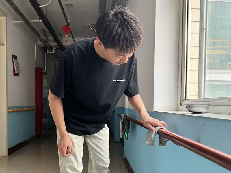 圖為實踐團成員為敬老院擦拭樓道扶手