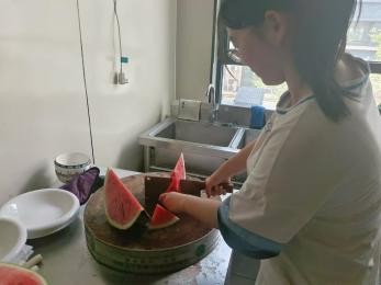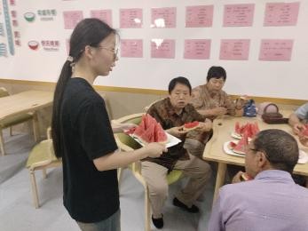 給老人們吃西瓜,和老人們聊天時,他們都非常的開心也非常的慈祥。他們都很健談樂觀,樂于與我們分享在養老院中的事情和他們年輕時的一些經歷。還有的老人也會給我們看他們的兒子女兒,甚至是孫子孫女的照片。