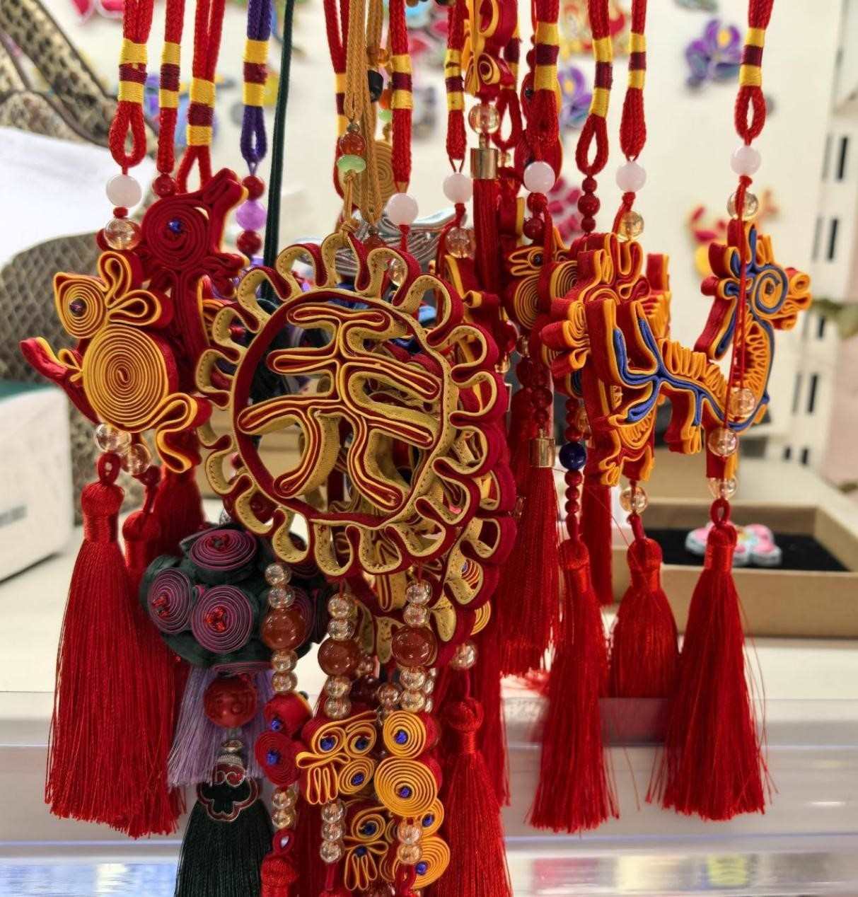 圖三 圖中展示的是色彩鮮艷的盤扣樣式的掛件,配以紅流蘇和珠子,頗具中式韻味。
