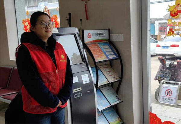 圖為實踐團成員李淑娟在巨野農商銀行丁官屯支行門口