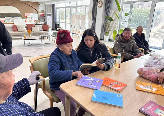 特別是在與老人們共讀書籍的活動中,幾位成員與老人們共同閱讀并交流書中的故事,老人們眼中閃爍著智慧與溫暖的光芒。大家沉浸在書本帶來的精神世界中,彼此間的距離也在不知不覺中拉近了。