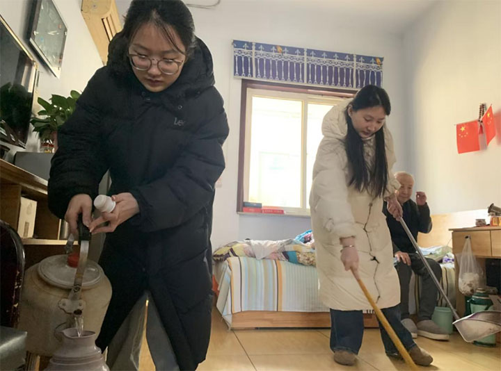 圖為實踐團成員王瑞娜、榮芯藝為老人接水、掃地