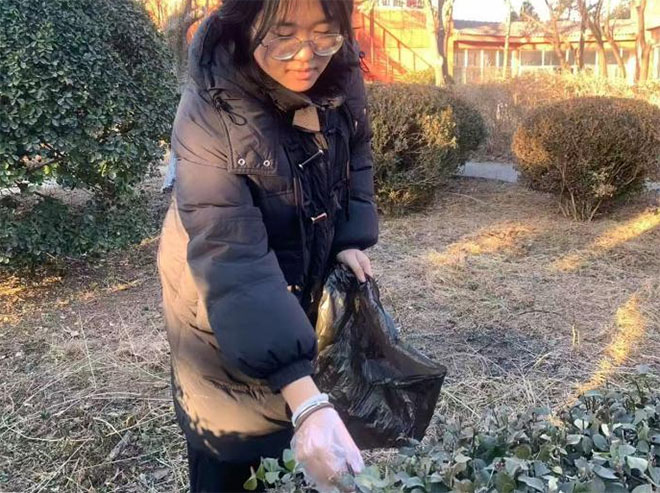 圖為“敬老尊賢”實踐團孫盈打掃室外花園衛生