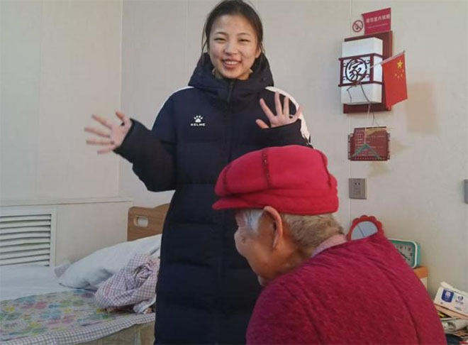 圖為“敬老尊賢”實踐團成員侯雨欣為老人表演“我愛北京天安門”