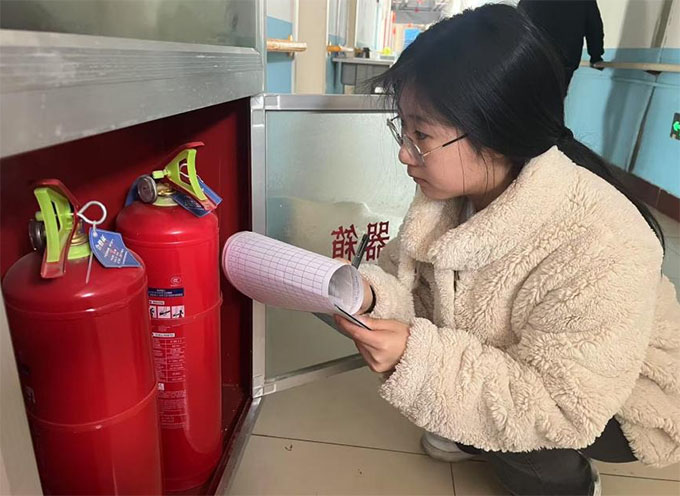 圖為實踐團成員蘇雅琦為養老院檢查消防設施