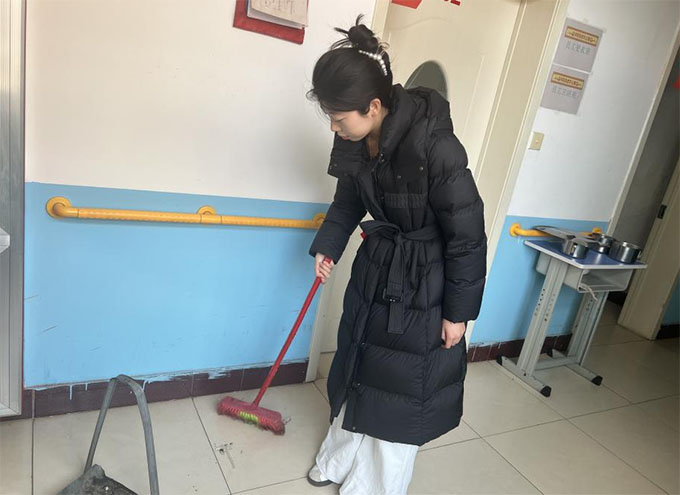 接下來,張添一同學細心地為老人們打掃宿舍,確保他們的居住環境整潔有序。徐小蕾同學則將老人們的被子拿到陽光下晾曬,讓老人們晚上能蓋上溫暖舒適的被子入睡。