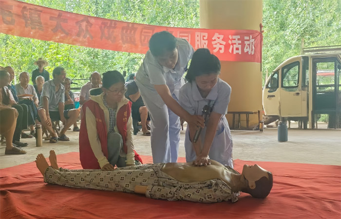 期間,實踐團主動對接當地需求,融入戲曲園服務場景。在戶外開闊場地,王櫻潤配合專業醫護人員,搭建起簡易教學區。以模擬人為教具,醫護人員分步講解心肺復蘇要點,實踐團成員在旁輔助演示,從輕拍雙肩判斷意識、解開衣物,到規范進行胸外按壓、精準實施人工呼吸,每個環節都清晰呈現。村民們圍攏觀看,不時提問,王櫻潤與醫護人員一同解答疑惑,推動急救知識真正貼近鄉村生活,讓村民遇到緊急情況時,多一份應對底氣。
