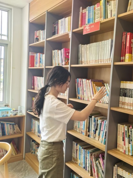 圖為團隊成員整理三朱村書房擺放的書籍。