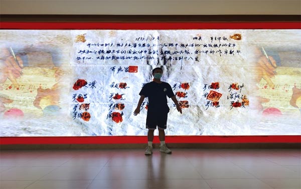 圖為當晚18戶村民在一紙分田到戶的“秘密契約”上按下鮮紅的手印的情景。