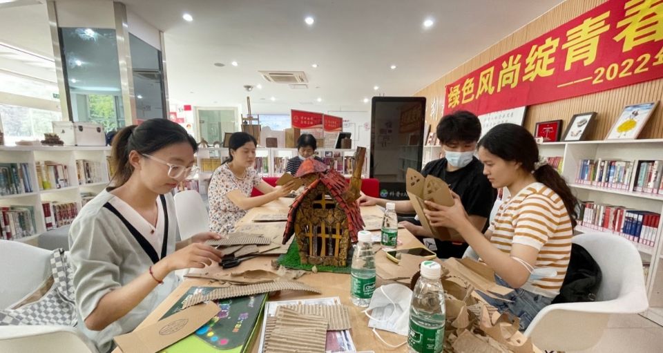 活動現場,實踐小分隊邀請了南通科院環資學院的榮梅娟老師,帶領社區居民用廢舊紙盒制作環保作品。大家勾勒輪廓、裁剪瓦片、點綴草地,通過剪切、組合、涂色,創造出一件件創意環保作品。在整個創作活動中,大家共同合作,現場氣氛十分熱烈。