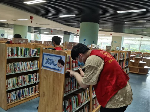 圖為實踐隊員將書籍擺上書架。 朱晨 攝
