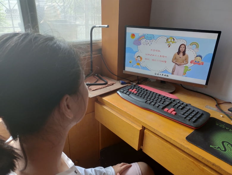 圖為實踐隊員邀請小朋友觀看防溺水安全教育視頻。 愛開大學(xué)生網(wǎng)通訊員 王源浩 攝