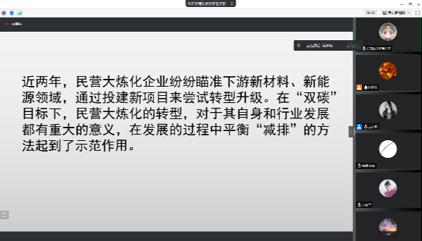 15號晚,實踐隊員通過騰訊會議開展線上會議,就各隊員前期在各地對政府與企業方面的調研進行分享與討論。首先,實踐隊員李夢迪向我們介紹了傳統國有企業在雙碳目標下的轉型與發展,其中提到了未來煤炭行業結構調整所要面臨的三大不變與兩大改變,以及現階段傳統能源行業所面臨的三大挑戰與應對策略。之后,實踐隊員王先祺向我們介紹了近期由騰訊牽頭,聯合科創可持續發展研究院聯合舉辦“雙碳重創“活動,并創立”零碳學院”,從而建立以碳中和共榮生態為核心的雙碳實踐服務示范平臺,為企業實行雙碳政策賦能。該活動受到大中小企業及政府部門的支持,是我國企業在雙碳背景下為轉型發展努力的典型代表。隨后,實踐隊員侯澤穎以民營大煉化轉型為例,進一步分析了企業的轉型之路。由于石油煉制、輕氫裂解等大型煉化項目碳排放量過大,民營大煉化企業紛紛瞄準下游新材料、新能源領域。同時,企業也將放眼長遠,把握減碳節奏,制定短期長期戰略計劃。除了企業的努力外,還有國家政策的支持與行業協會的指導。而實踐隊員邵云霄則聚焦貴州工程中的一項新技術—煤層氣的開發與利用。將煤層氣轉化為可使用的,在一定程度上減少了在開采過程中的碳排放量。段冰穎則介紹了當地政府的一項雙碳政策,政府召開雙碳工作領導小組全面部署會議,成立工作專班,該工作專班的工作包括科學引領規劃、摸清碳排放現狀、制定全社會減碳計劃等等。這是全國各地政府為響應雙碳政策所作努力的縮影。當然雙碳其實就在我們身邊,實踐隊員侯懿峰介紹了青島住建局踐行雙碳,探索城市綠色發展的系列舉措。包括以“節能保暖工程”為例的綠色節能計劃,以實現五個零(零垃圾、零廢水、零廢棄、零廢熱、零能耗)為代表的綠色建材,為綠色企業提供經濟支持為目的的綠色金融。最后,陳思達則總結了全國各省十四五規劃中的雙碳目標及規劃,使實踐隊員對政府做的工作有了整體認識。