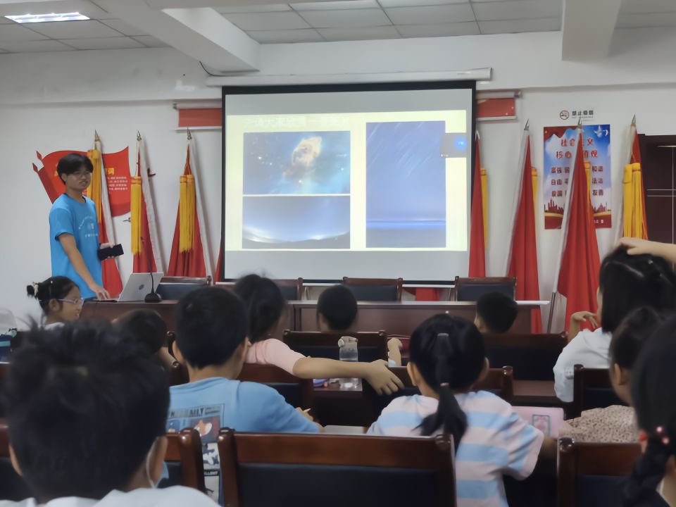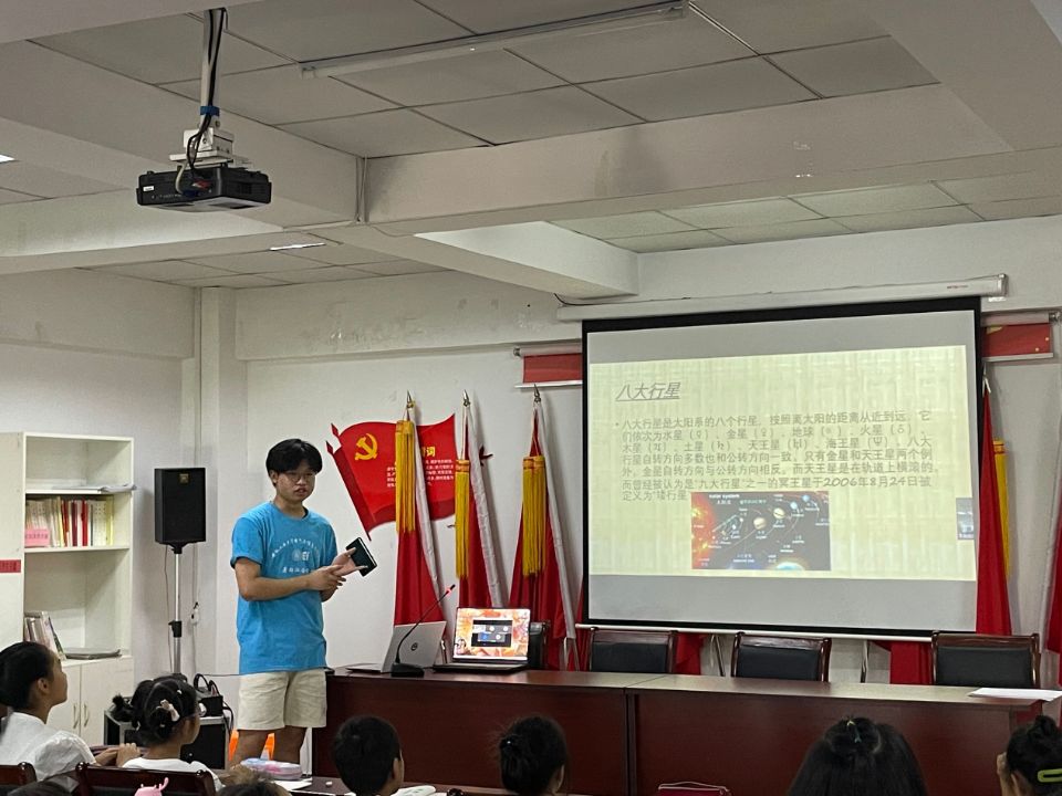 愛(ài)開(kāi)大學(xué)生馬鞍山7月5日電( 通訊員 汪麗 ) 為傳播科學(xué)文化知識(shí),激發(fā)少年兒童對(duì)天文知識(shí)的興趣。2022年7月5日安徽工業(yè)大學(xué)電氣與信息工程學(xué)院赴學(xué)苑社區(qū)愛(ài)心支教實(shí)踐隊(duì)在馬鞍山市雨山區(qū)學(xué)苑社區(qū)黨群服務(wù)中心開(kāi)展了天文知識(shí)科普講座活動(dòng)。