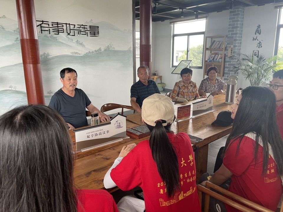 下午兩點半,團隊成員來到雙塘社區村委會對村內的老黨員進行訪談,爺爺奶奶們從組織,文化,生態,人才,產業五方面為實踐小隊介紹了雙塘村鄉村振興的經驗和成果。其中,著重強調了雙塘村的生態發展的變化,在“無工不富”的八十年代,雙塘村內也有著數家工廠,對環境造成了一定影響,在認識到“綠水青山就是金山銀山”后,雙塘村進行了鄉村振興戰略的轉型,在發展經濟的同時保護環境,通過營造更好的生態環境來帶動經濟的發展。最后,他們表示,相信在黨的帶領下,雙塘村一定會發展得越來越好。