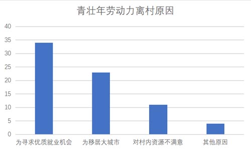 在村內建設良好的基礎上,為探究青壯年勞動力流失原因,實踐團針對72名家中有青壯年常年離村務工的村民設置為尋求優質就業機會、為移居大城市、對村內資源不滿意、其他原因四項選擇,如下圖所示,可以看出尋找優質就業機會約占50%。