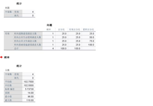 再通過統計運行分析如下圖得出四項建設滿意人數均值為102.75,占總樣本人數:102.75÷114=90.1%