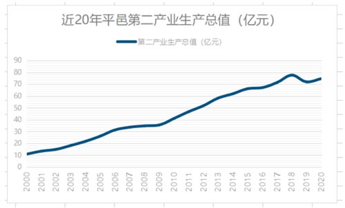 實踐團收集近20年平邑縣第二產業生產總值(億元),并利用Excel進行統計分析,利用折線圖的方式,清晰明了的表現出平邑第二產業的穩步發展。證明平邑在第二產業振興方面成效顯著。