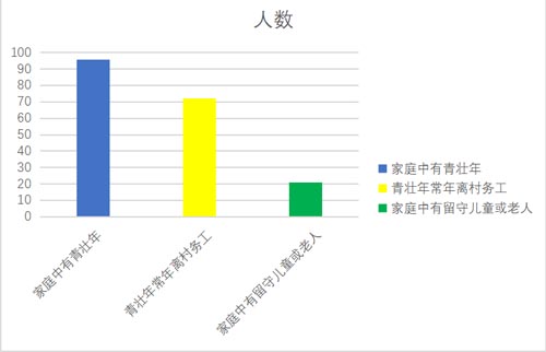 而另一方面,為探究村內青壯年勞動力問題,實踐團首先設置家中是否有青壯年問題初步篩選針對人群,再通過家中青壯年是否離村務工、家中是否有留守老人或兒童兩個問題從正側面兩個角度保證準確性,再利用Excel分析村內青壯年勞動力數據,如下圖所示,可得村內青壯年生產力向外流失較為嚴重。
