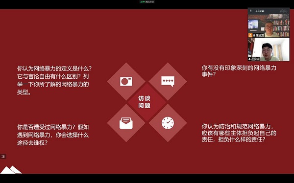 2022年8月25日,山東大學(xué)法學(xué)院“筑牢法治防線 ,清朗網(wǎng)絡(luò)空間”赴河北邯鄲、山東東營等地關(guān)于網(wǎng)絡(luò)暴力立法規(guī)制調(diào)研團(tuán)成員陳呈龍開展一對一半結(jié)構(gòu)式訪談活動,采訪西南大學(xué)學(xué)生許宇瑄。基于疫情反復(fù)的社會背景,此次訪談采用線上形式。