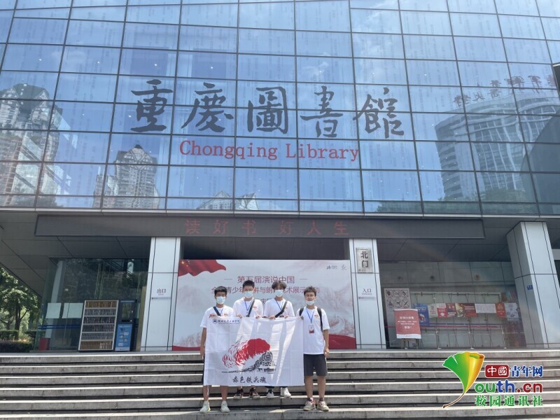 圖為“赤色鐵兵魂”團(tuán)隊(duì)在重慶圖書(shū)館門(mén)口合影留戀。 中國(guó)青年網(wǎng)通訊員周宇寬 攝