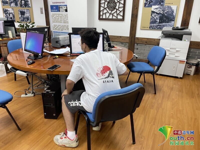圖為“赤色鐵兵魂”團(tuán)隊(duì)在電子資料室內(nèi)尋找有關(guān)鐵道兵的資料。 中國(guó)青年網(wǎng)通訊員 周宇寬 攝