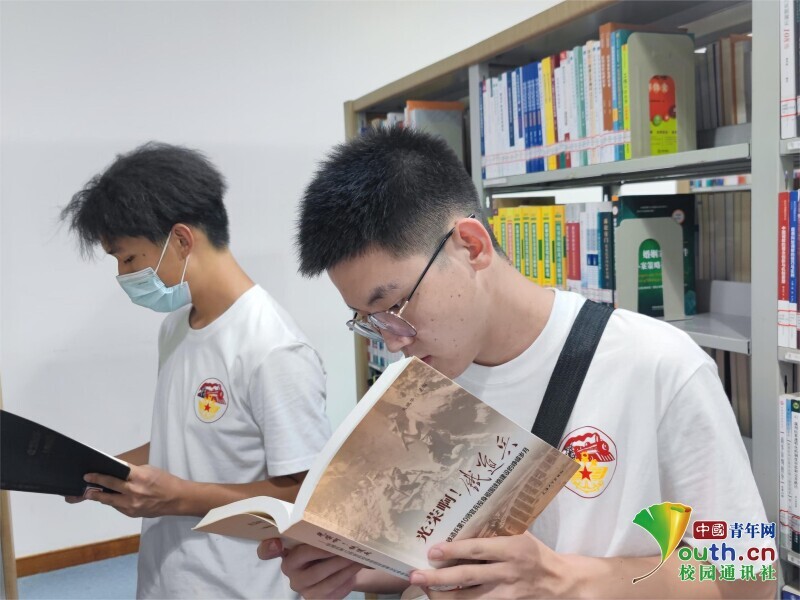 圖為“赤色鐵兵魂”團(tuán)隊(duì)在歷史閱覽室內(nèi)尋找有關(guān)鐵道兵的資料。 中國(guó)青年網(wǎng)通訊員 周宇寬 攝