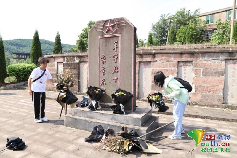 圖為社會(huì)實(shí)踐團(tuán)隊(duì)成員清理打掃烈士墓。 中國青年網(wǎng)通訊員 駱張瑾 攝