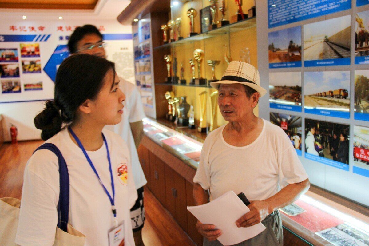 圖為團隊成員與老鐵道兵一同參觀鐵二處展廳,老鐵道兵為團隊成員講述相關歷史和個人經歷。中國青年網通訊員 周亞琪 供圖