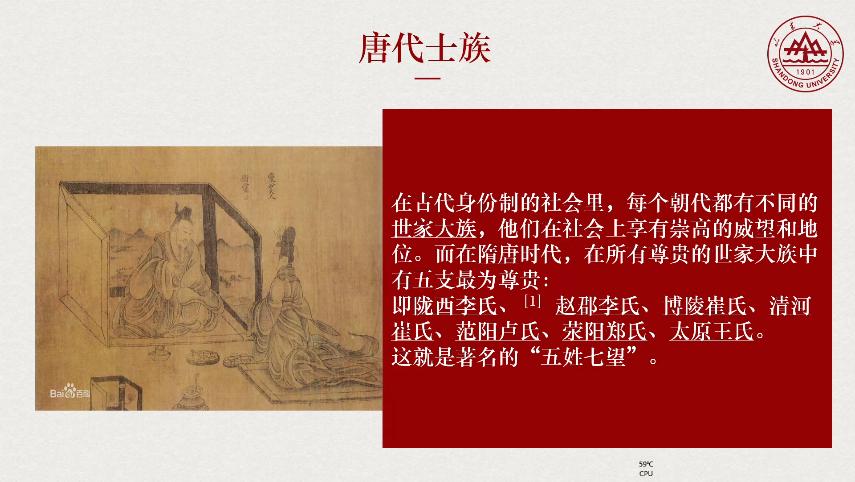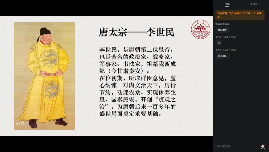 課程一開始,支教老師首先從同學(xué)們所了解的唐朝事物介紹入手,并且搭配了一定的互動問答。然后,老師結(jié)合詢問同學(xué)們熟人的姓氏,順利將話題引入到對唐代五姓貴族的介紹當(dāng)中。在教學(xué)過程中,老師著重對“士族”一詞的解釋,為后面順利教學(xué)打下基礎(chǔ);然后還通過視頻、圖片展示等方式多元的體現(xiàn)當(dāng)時“五姓七望”的重要地位。隨后,老師通過結(jié)合概括性文字和每個家族的名人介紹,讓各位同學(xué)都深刻了解唐代這幾個最著名的望族。接下來,老師以一個問題開頭,引導(dǎo)同學(xué)們思考士族為唐代社會帶來的桎梏;之后以視頻與文字形式詳細(xì)介紹了安史之亂與科舉制對世家大族的影響,完整闡述了士族的沒落。最后,老師以“希望同學(xué)們得以在這節(jié)課窺見盛唐的輝煌”作結(jié),并繼續(xù)引導(dǎo)同學(xué)們在課后以“五姓七望”的歷史為鑒,得出自己的思考。