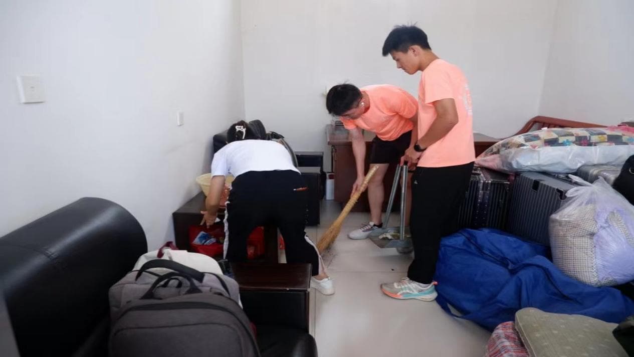 圖為后勤組成員打掃洼子村辦公室衛(wèi)生