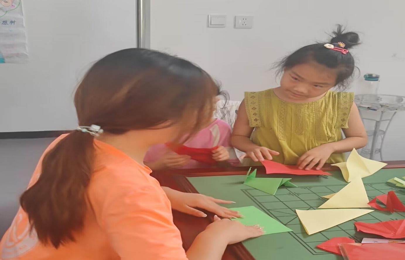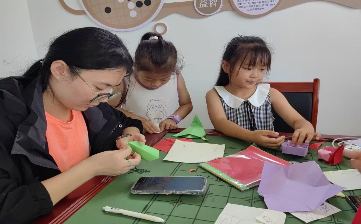 圖為實踐團成員教學生們折紙中華文化上下五千年,源遠流長。折紙屬于中華優秀傳統文化其中之一,實踐團成員在學生們的課余休閑時間,教學生們折紙,比如:玫瑰花、蝴蝶結、千紙鶴、小青蛙等等。折紙可以鍛煉人的綜合協調能力,發展學生的創造能力、想象力和形象的思維能力。學生們認真跟隨實踐團成員學習折紙,動手實踐。通過此次活動,同學們釋放壓力,鍛煉動手能力,發揮創意想象,疊出不錯的折紙作品。