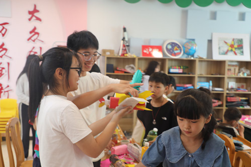 因為塑料瓶質地堅硬,在剪切的過程中會誤傷孩子,團隊成員們會時刻注意,幫助有需要的小朋友。在制作的整個過程中,每個小朋友都專心致志,充分發揮想象力,讓自己的塑料瓶煥然一新。有設計成各種各樣的小動物的,有設計成航模飛機的,還有設計成筆筒的。每個作品都獨具一格,別出心裁,不用的廢棄塑料瓶也可以通過孩子們的巧手“變廢為寶”。通過這次手工課,孩子們都明白了廢舊物品也能變為有用的東西,理解了資源回收利用的意義。