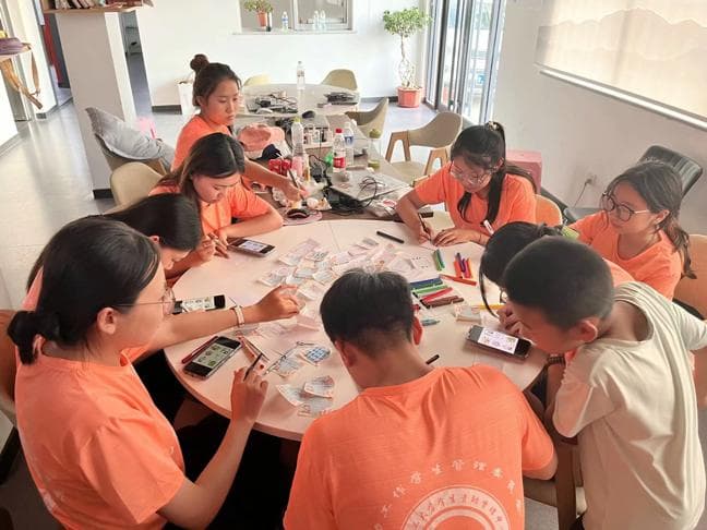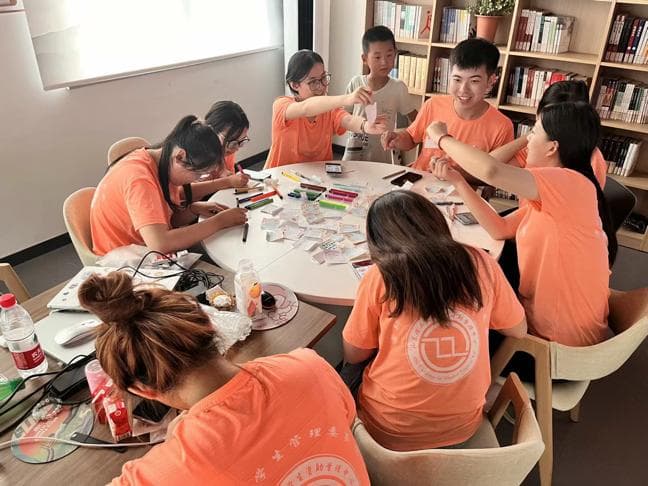 圖為“芒果行動”實踐團成員制作便簽時學生前來學習參與制作的場景