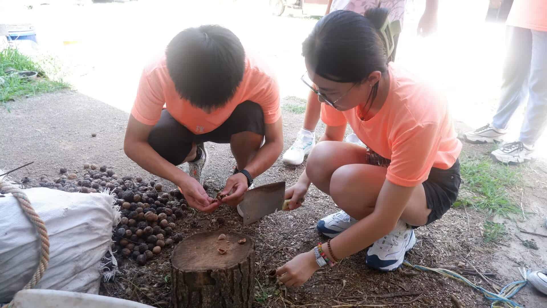 圖為實踐團成員體驗核桃生產過程