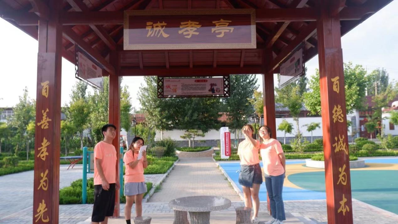 圖為實踐團成員調研當地村民對于文化村莊建設成果的滿意度隨后,實踐團成員走訪村內各文化建設,切實感受洼子村對于文化新村的建設成果斐然。實踐團成員調研了解到,誠孝亭廣場建成于2023年年初,亭子中刻有關于誠孝的相關典故,四周也有關于誠孝的相關立碑,亭子附近有各種健身設施和休息場所,方便村民們進行娛樂活動,是文化新村建設的代表性建筑。