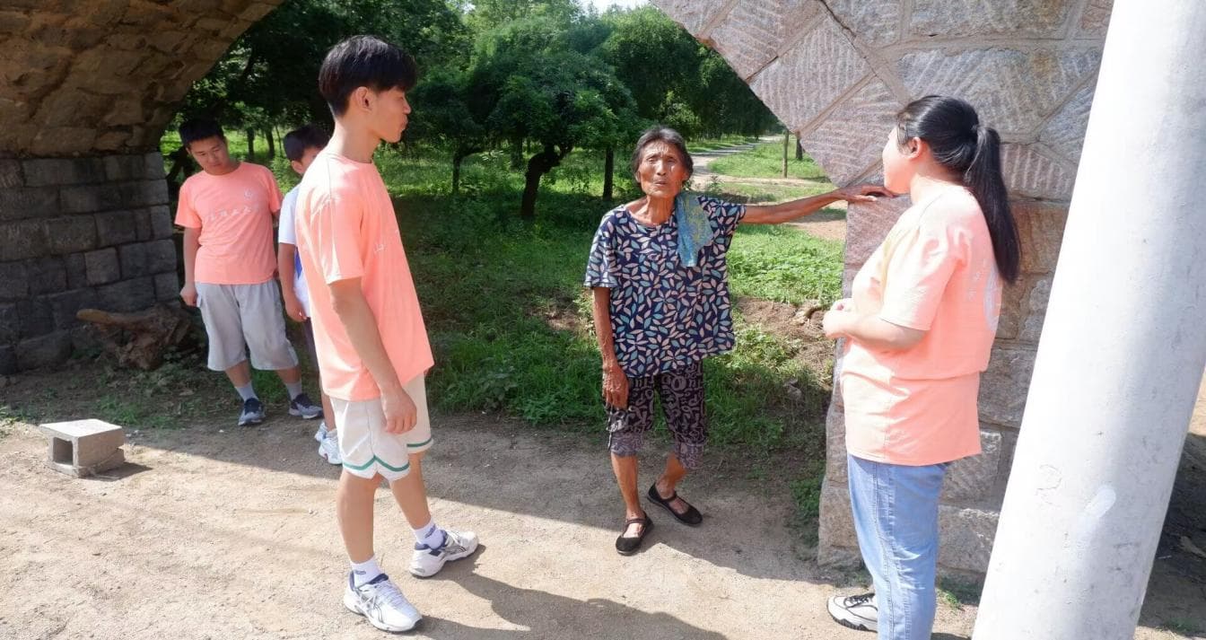 圖為實(shí)踐團(tuán)成員向當(dāng)?shù)卮迕裨儐柈?dāng)?shù)鼐G化的種植情況