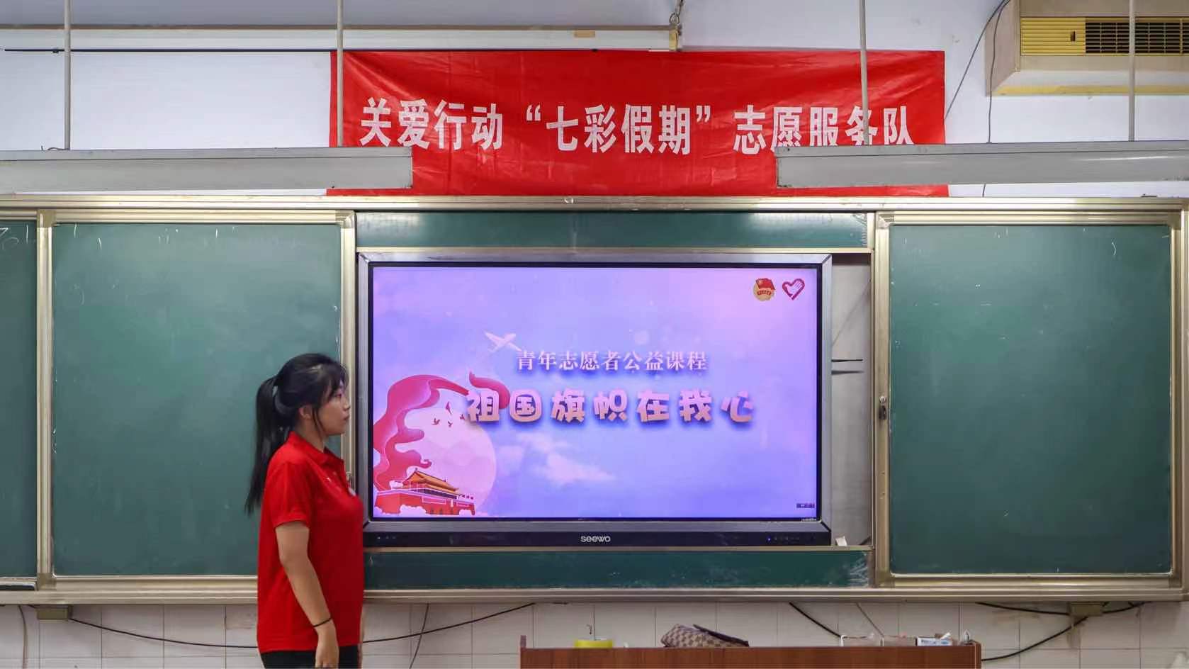 為發揚紅色精神,感受旗幟內涵,樹立正確的世界觀、人生觀、價值觀,7月21日,“愛之傳承”實踐團開展“認識國家旗幟,弘揚中國精神”紅色教育系列課程。實踐團成員馬佳欣、林洺蔚、楊召珍進行授課,引導學生認識并牢記重要旗幟,了解其歷史背景,培育學生正確的價值導向。